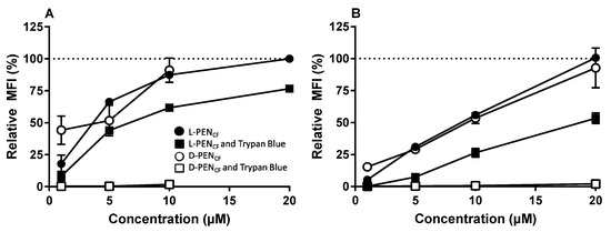 Caco-2 cells and HepG2 cells were also subjected to analysis by flow cytometry to provide a semi-quantitative evaluation of the cellular uptake of l-PENCF and d-PENCF after incubation with the 1–20 µM peptide. The enantiomers of PENCF were taken up at similar levels in the cells when incubated at concentrations in the range of 5–20 µM (Figure 3). A parallel experiment was performed under the same conditions as previously described, with the exception that Trypan Blue (0.1% (v/v) final concentration) was added as an extracellular quencher to the samples just prior to the analysis by flow cytometry. For data analysis, the relative mean fluorescence intensity (MFI) was normalized to the fluorescence of cells incubated with 20 µM l-PENCF without Trypan Blue treatment. Under those conditions, the cells exposed to d-PENCF exhibited an >95% reduction in fluore-scence at any concentration. By comparison, cells exposed to l-PENCF displayed an approximately 50% decrease in the detected fluorescence at any concentration. HepG2 cells exposed to d-PENCF at concentrations above 10 µM displayed morphological aberrations, and these were omitted from further analysis.