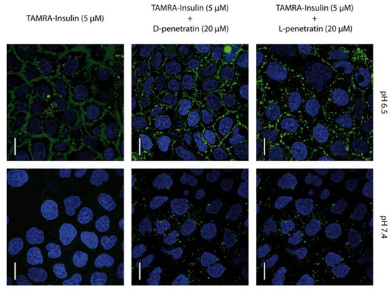 PEN-mediated delivery of TAMRA-insulin into Caco-2 cells at pH 6.5 and 7.4. Cells were incubated with TAMRA-insulin (5 µM, green) and l-PEN or d-PEN (20 µM) for 1 h, followed by staining of nuclei with Hoechst 33,342 (blue), while no membrane-compromised cells were found upon including staining with DRAQ7 as no magenta DRAQ7 fluorescence was detected. The images are representative of the same passage of cells, and the experiment was repeated in two different passages of cells. Scale bar 20 µm.