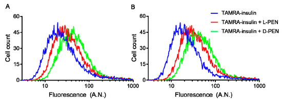 Uptake of TAMRA-insulin in Caco-2 cells displayed as histograms at pH 6.5 (A) and 7.4 (B). Cells were treated with test solution (5 µM TAMRA-insulin only (blue) as well as with 20 µM l-PEN (red) or d-PEN (green)) for 1 h, followed by trypsinization and analysis by flow cytometry. Mean fluorescence in arbitrary units (A.N.) from two independent experiments.