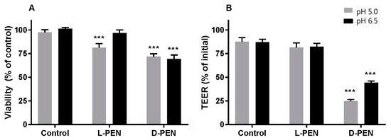 Viability (A) as indicated by metabolic activity using the MTS/PMS assay, and integrity (B) measured by TEER of Caco-2 epithelium upon exposure to l-PEN or d-PEN at 40 µM at pH 5 (grey) and pH 6.5 (black). Data were pooled from permeation experiments performed separately for each cargo. Metabolic activity was calculated relative to the activity of buffer-exposed control cell monolayers at pH 6.5. Asterisks indicate significant differences (*** p < 0.001). Mean ± SEM, N = 2–3, n = 12.