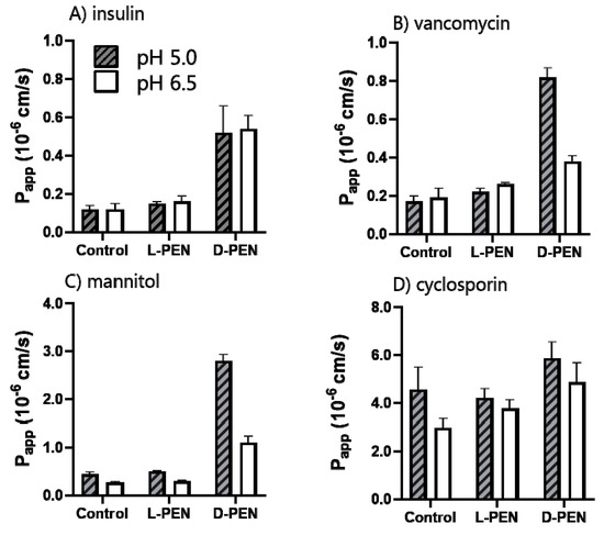 Apparent permeability coefficients (Papp) for different cargos across Caco-2 monolayers in the presence of 40 µM l-PEN or d-PEN at pH 5.0 (grey, dash) and 6.5 (white). TAMRA-insulin (A), vancomycin (B), mannitol, and (C) cyclosporin (D). Mean ± SEM, N = 2–3, n = 3.