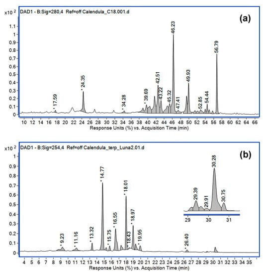 HPLC-DAD chromatograms for Calendula officinalis extract: (a) Mediterranea Sea 18 column, formic acid (0.1%, v/v) in water and methanol, 280 nm, ESI (+); (b) Phenomenex C18 Luna column, water and formic acid (0.1%, v/v) in acetonitrile, 254 nm, ESI (−).