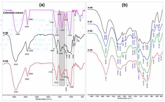 (a) FTIR spectra of Calendula officinalis extract, P/PVA hydrogel (H #0 sample), and Calendula officinalis 20% (wt.)-loaded P/PVA hydrogel (H #3 sample); (b) FTIR spectra region between 800 and 1900 cm−1 for the unloaded and Calendula officinalis-loaded P/PVA hydrogels.