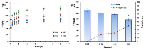The capacity of the hydrogels to swell in simulated skin condition media was evaluated from the swelling ratio as follows: 35 mg of dried hydrogels was immersed in phosphate buffer (PB, 0.0667 M KH2PO4 + Na2HPO4) with pH 5.5 at 32 °C. At different time intervals, the samples were taken out from PB solution and the excess of the aqueous media was removed with blotting paper. Finally, the samples were weighed and the swelling ratio (SR) and equilibrium swelling ratio (SReq) were calculated following Equations (2) and (3):