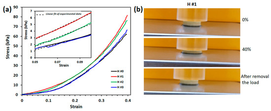 where σ—compressive stress; ε—strain; F—force (N); A—cross-sectional area of the hydrogel (m2); Δl—change in length; and l0—original length.