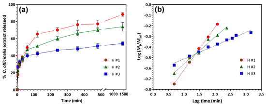 where Mt is the cumulative amount of the C. officinalis extract released at time t, Minf is the initial concentration of the extract in the P/PVA hydrogels, k is the Korsmeyer release constant dependent on the polymer characteristics, and n is an exponent which defines the mechanism of release, whether it is diffusion-controlled or both diffusion- and erosion-controlled. The value (n) was determined from the slope of the logarithmic plot of release rate versus logarithm of time (t).
