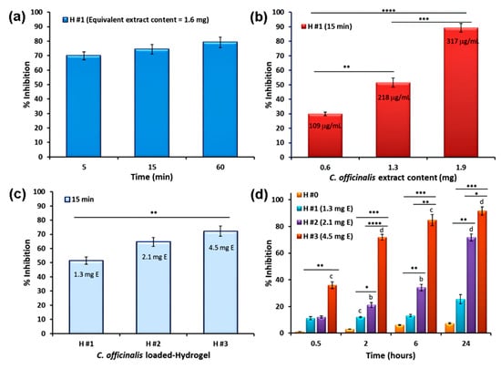 The antioxidant activity of the C. officinalis-loaded hydrogels and pure extract was evaluated using the 2,2-diphenyl-1-picryl-hydrazyl (DPPH) method according to the literature [47,48,49].