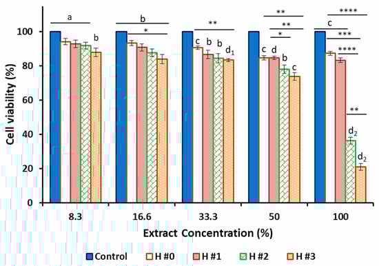 Cytotoxic evaluation of hydrogels without and with C. officinalis extract was performed by MTT assay as follows: Human Dermal Fibroblasts (Thermo Fisher Scientific, Bleiswijk, The Netherlands) adult (HDFa) cells were cultured in Dulbeco’s modified Eagle medium (DMEM) supplemented with 10% FBS, 1% (v/v) streptomycin-penicillin, and 1% (v/v) non-essential amino acids, at 5% CO2 and 37 °C. The cells were allowed to 80% attach to the surface of 7 mL NuncTMEasYFlask™ cell culture flasks (Thermo Fisher Scientific Co., Waltham, MA, USA) and then were trypsinized with 0.05% trypsin solution at 37 °C. After centrifugation and re-suspension in fresh medium, the viable cells were cultivated on 96-well plates, allowed to attach for 24 h prior to the treatment, and after that treated with various concentrations of the diluted extracts of hydrogel samples for 24 h. Thus, after the sterilization of the hydrogels by UV for 5 min, ~9 mg of unloaded or C. officinalis-loaded samples was incubated in 5 mL of culture medium for 24 h at 37 °C, after which the mixture was centrifuged for 5 min at 2000 rpm/min. Then, a series of dilutions equivalent to 100%, 50%, 33.3%, 16.6%, and 8.3% of the extract in the medium were added to the plate and incubated for 24 h. After the incubation time, 100 µL of culture medium was replaced with the same volume of fresh medium and 10 µL of MTT dye (from 5 mg/mL stock) was added to each well and incubated for 4 h at 37 °C with 5% CO2. Further, 90 µL of medium was removed and the formazan crystals, resulting from cellular reduction of MTT, were dissolved in DMSO (100 µL) solution and incubated for 10 min at 37 °C. The absorbance at 570 nm was measured using a Multiskan FC automatic plate reader (Biotek, Germany). Cell viability, expressed as % of untreated cells (control) considered 100% viable, was calculated according to Equation (10):