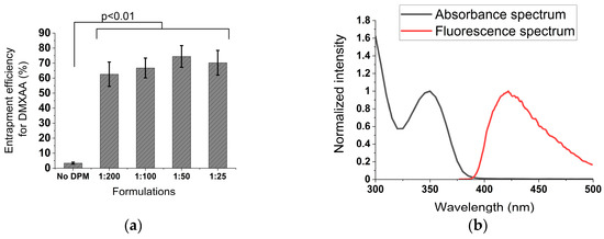 After the determination of the DMXAA and DPM content, respectively, via absorbance and the BaCl2/I2 assay, the equation (Equation (1)) below was used to determine the entrapment efficiency (EE) of both the DMXAA and the DPM.