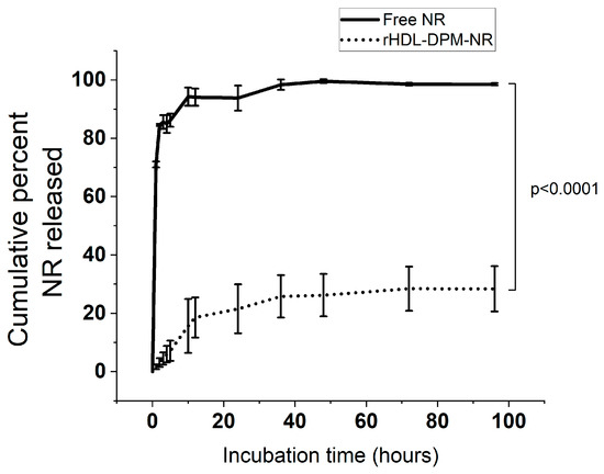 Considering their slightly better physicochemical characteristics than their 1:25 counterpart and having a higher amount of DPM compared to the 1:200 and 1:100, the 1:50 rHDL-DPM NPs were utilized for the subsequent studies. To assess the ability of the particles to retain payload, rHDL-DPM-NR particles were assembled and allowed to release their payload (NR) through a dialysis membrane into the release buffer (PBS). While almost the totality of the free NR was readily released into the buffer during the first few hours of incubation, only 30% of the NR was released by rHDL-DPM NPs at the end of 96 h of incubation (Figure 4).