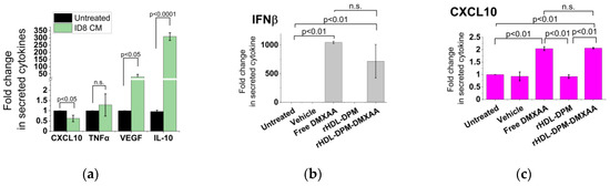 In epithelial ovarian cancer (EOC), targeting the prominent M2 immunosuppressive TAMs to promote an M1 phenotype has shown promising results in EOC treatment in clinics [51,52]. Hence, macrophages educated by ovarian cancer constitute a suitable model to assess the M2-to-M1 reversal effect of the rHDL-DPM-DMXAA NPs. Since factors derived from EOC cells have been shown to produce an M2-like pro-tumoral phenotype in TAMs [53,54], RAW 264.7 murine macrophages were exposed to the CM of murine EOC cells (ID8) to create an in vitro model of TAMs. While exposure to ID8 CM slightly decreased levels of secreted M1 phenotype-related cytokine CXCL10, it induced nearly a 50-fold and a 300-fold increase in the secreted levels of the angiogenic factor VEGF and of IL-10 (an M2 phenotype-related cytokine [55]) respectively, in RAW 264.7 macrophages. No significant change was observed for secreted TNFα, also an M1 phenotype-related cytokine (Figure 5a).