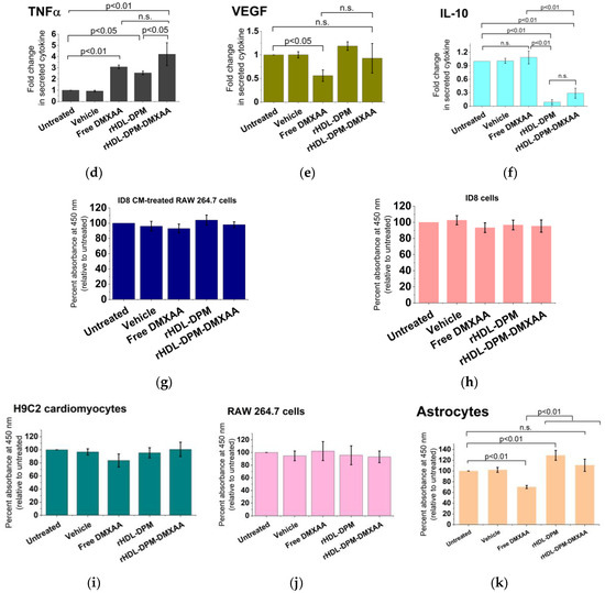 The rHDL-DPM-DMXAA NPs induce the production of M1 phenotype-related cytokines in ID8 CM-educated RAW 264.7 macrophages. (a) Quantification of secreted CXCL10, TNFα, VEGF, and IL-10 secreted in the supernatant of ID8 CM-educated RAW 264.7 cells via ELISA, n.s. (non-significant); (b–f) effect of rHDL-DPM-DMXAA NPs and associated controls on the designated cytokine secretion by the ID8 CM-educated RAW 264.7 macrophages; (g) assessment of the cytotoxic effect (CCK8 assay) of the rHDL-DPM-DMXAA 1NPs and associated controls (Equation (4)) on ID8 CM-educated RAW 264.7 macrophages; (h) assessment of the cytotoxic effect (CCK8 assay) of the rHDL-DPM-DMXAA NPs and associated controls on the ID8 cells; (i) assessment of the cytotoxic effect (CCK8 assay) of the rHDL-DPM-DMXAA NPs and associated controls on the H9C2 cardiomyocytes; (j) assessment of the cytotoxic effect (CCK8 assay) of the rHDL-DPM-DMXAA NPs and associated controls on untreated RAW 264.7 cells; (k) assessment of the cytotoxic effect (CCK8 assay) of the rHDL-DPM-DMXAA NPs and associated controls on astrocytes. The data are representative of three independent experiments and are graphed as mean ± SD.