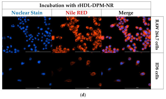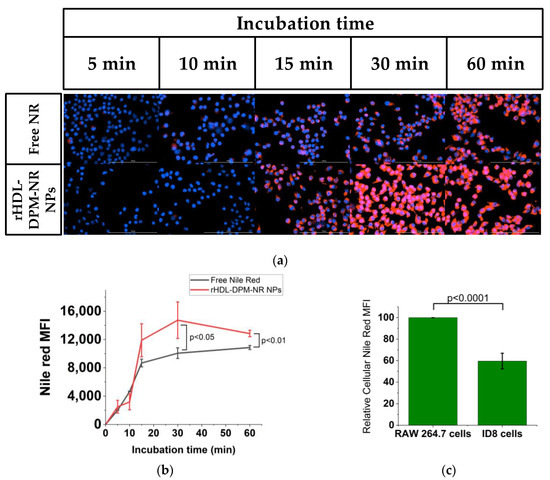 To investigate the effects of rHDL NPs on payload uptake, the ID8 CM-educated RAW 264.7 cells and ID8 cells were treated as previously described [46,47] with some modifications. Briefly, 2 × 105 cells (RAW 264.7 cells, ID8 cells) were seeded in a poly-D-lysine-coated 35 mm glass-bottom dish and allowed to attach overnight. The RAW 264.7 cells were treated with ID8 CM, as described above. Before the uptake studies, the cells were rinsed twice with PBS and incubated either with the free NR or with the 1:50 rHDL-DPM-NR (with an equivalent amount of 0.5 µM NR) dispersed in cDMEM. Then, the cells were incubated for 5 min, 10, 15, 30 min, and 60 min. After incubation with the NR formulations, the cells were washed 3 times with PBS and either incubated with 5 µM Hoechst nuclear stain in PBS for 10 min, followed by 3 washes of PBS and re-incubated in phenol red-free DMEM media. The visualization of the cells and the NR mean fluorescence intensity (MFI) analysis per cell were performed using the Biotek Cytation Image reader and its cellular analysis features. The same exposure settings (intensity, integration time, camera gain) were utilized for all treated cells within an experiment to allow comparison between treatments.