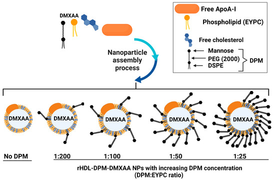 Different amounts of DPM (1:200, 1:100, 1:50, 1:25, DPM:EYPC ratio in the nanoparticles) were first tested to obtain particles that have maximal DPM and DMXAA loading capacity, as well as desirable physical characteristics (minimum particle diameter size and polydispersity index, negative zeta potential) for the cellular studies. The resulting formulations were characterized (Scheme 1). These DPM:EYPC were selected based on previous findings with mannosylated liposomes by other investigators [48] and on the number of lipid molecules (about 160 up to 300) per particle uncovered by both optimization studies and computational modeling studies of HDL-type particles [41,49,50].