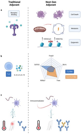 Engineering new immunological outcomes with adjuvants. Comparison of traditional adjuvants to next-generation adjuvants. (a) Next-generation adjuvants target pathways other than just PRRs. Cell death releases DAMPs, metabolic alteration improves cell sensitivity, and epigenetic modifications reprogram cells towards a trained immunity phenotype. (b) T-cell polarization shifted from cytokine classification to transcription factor classification. Next-gen adjuvants may create new immunophenotypes. (c) Traditional adjuvants elicit large amounts of inflammatory cytokines, while next-gen adjuvants reduce reactogenicity and improve adaptive responses.