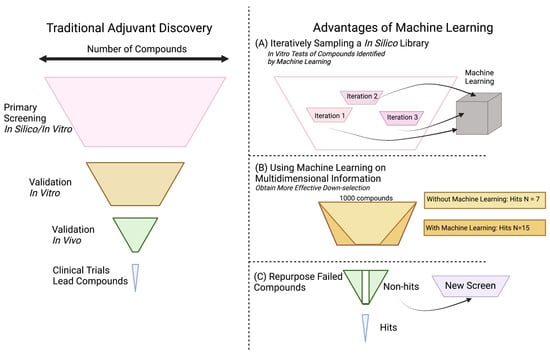 Machine learning in the adjuvant discovery space could also increase the number of successful compounds that pass major transition points in the discovery pipeline. Many in silico screens have failed to replicate computational results upon in vitro validation. Similarly, many compounds have failed to translate from murine models to non-human primates [76,77]. These are large challenges that machine learning may be able to help “de-risk”. Using multidimensional systems vaccine information and meta-analyses, machine learning could identify correlations between hit compounds that would not otherwise be apparent, yielding higher quality and number of compound hits. (Figure 3B). Additionally, machine learning algorithms could search already established datasets, such as those with drugs that did not pass clinical trials, to repurpose them for alternate uses such as adjuvants (Figure 3C). As the field of adjuvant discovery continues to develop, greater collaboration with machine learning groups can help provide new methods of understanding data and improving outcomes. In our limited experience, one can conceive of machine learning not as a replacement for current methods, but as an accelerant. As computers can be a “bicycle for the mind”, we suggest that adjuvant developers consider machine learning as a research assistant that can cut out the labor of screening and provide further clarity on projects where large-scale correlation is helpful.