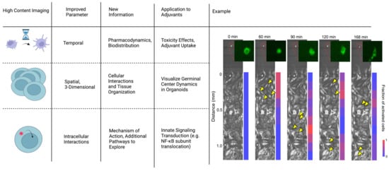 High-content imaging allows for the visualization and quantification of therapeutic interactions in cell populations using multiparameter algorithms and fluorescent labeling [78]. High-content imaging has primarily been used in other drug discovery applications, but these techniques can be applied towards adjuvant discovery. Imaging has historically been limited by spatiotemporal restrictions and practicality. Recently, however, improvements in the technology now allows for improved visualization of three parameters: temporal dynamics, spatial organization, and intracellular interactions (Figure 4). By visualizing temporal dynamics, high-content imaging was used to develop an algorithm to screen for six parameters of hepatoxicity. This technique predicted high-risk drugs that potentially induce liver injury [79]. Similar algorithms could help screen adjuvants for adverse effects as the mechanisms of toxicity are not fully understood [10]. For monitoring spatial organization, researchers currently use multi-cellular models to recapitulate tissue repair, observe tumor growth, and quantify therapeutic interactions in 3D [80]. Reid et al. used high-content imaging to develop an algorithm to track changes in GFP expression levels for individual z-stack planes of a multicellular tumor spheroid in real time [80]. In the context of adjuvants, this will aid in studies using organoids to study immune phenomena such as germinal center reactions. We discuss organoids more in depth in the following section. Finally, highlighting the potential for monitoring intracellular effects, recent studies identified R788 disodium as an activator of the NF-κB pathway. The gradual entry of Rel-B into the nucleus after treatment with R788 was measured in a direct application of high-content imaging for adjuvant discovery. Meanwhile, this same technique was used to measure the inhibition of NF-κB via treatment with dehydrocostus lactone [81]. Studies using alternative delivery systems can visualize and measure cellular irregularity, antigen distribution, and cell activation [82,83,84,85]. As it relates to adjuvant discovery, high-content image analysis improves the optimization of screening compounds by predicting mechanisms of action, adverse effects, and improving accuracy. Using this technique, researchers can develop various assays to visualize the biodistribution and cytotoxicity of potential adjuvants in 3D multi-cellular models.