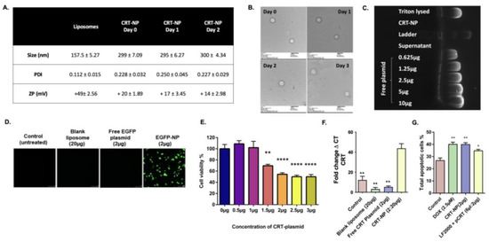 The hydrodynamic diameter, polydispersity index (PDI), and zeta potential of blank and CRT-NPs were measured using DLS. Blank liposome NPs showed a zeta potential of +49 mV, a mean size of 157 ± 5.27 nm, and a PDI below 0.15. CRT-NPs had larger diameters of 299 ± 7.09 nm with a PDI of 0.228 ± 0.032 and a decreased zeta potential of +20 mV ± 1.89 (Figure 1A). CRT-NPs stored at 4 °C showed no major variations in hydrodynamic diameter, while their zeta potential slightly decreased to +14 mV on day 3. The morphological stability of the CRT-NPs was confirmed using transmission electron microscopy for up to three days. The CRT-NPs exhibited a typical spherical morphology with an average size of approximately 280 nm (Figure 1B). The efficient CRT plasmid encapsulation in the NPs was also confirmed by the agarose gel retardation assay, which showed the absence of plasmid migration from the unlysed CRT-NPs. In contrast, the free plasmid (~2.6 µg) released from CRT-NPs with triton showed a band corresponding to a 2.5 µg free plasmid band (Figure 1C).
