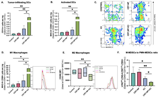 CRT-NPs + antiCTLA4 induced superior CD11c+ dendritic cell infiltration compared to monotherapies and untreated controls (Figure 3A). The frequencies of activated DCs (CD11c+ MHC-II+ CD86+) (Figure 3B,C) and M1 macrophages (CD11b+ MHC-II+ CD86+) (Figure 3D) increased ~5-fold compared to respective controls. The expression of the M2 macrophage marker, CD206, also significantly reduced in CD11b+ macrophages in CRT-NP+ICI-treated tumors compared to all other groups (Figure 3E), whereas the M-MDSC (CD11b+ LY6CHi LY6G-) population decreased ~4-folds vs. the CRT-NP and control group and ~2-fold vs. the ICI group (Figure 3F).