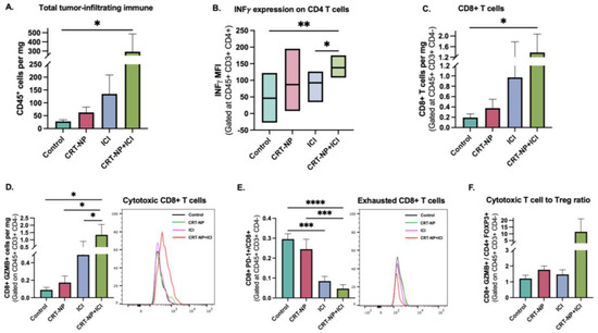 Immune infiltrations detected using the pan-leukocyte marker CD45 showed significantly higher populations in tumors treated with CRT-NP+ICI (Figure 4A). These results were corroborated by the infiltration of CD3+ and CD8+ T cells and enhanced expressions of INFγ on CD4+ T cells (Figure 4B,C) in the combinations relative to the untreated control and monotherapies. CRT-NP+ICI also significantly increased cytotoxic CD8+ GZMB+ T cells compared to monotherapies and reduced exhaustion markers PD1 on CD8 T cells (Figure 4D,E). A higher ratio of CD8+ GZMB+ to CD4+ FOXP3+ was also observed in the CRT-NP+ICI treatment relative to other groups (Figure 4F).