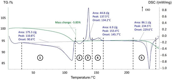 Figure 1. TGA-DSC analysis (5 °C/min) of prednisolone sesquihydrate. The green curve displays the TGA signal, whereas the blue curve displays the DSC signal.