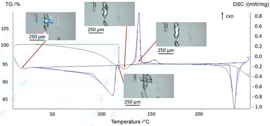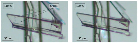After dehydration (visually occurring at around 100 °C), the crystals display characteristic cracks perpendicular to the major growth axis of the crystal but keep their overall shape, edges, and facets [11]. On subsequent heating, these macroscopic defects disappeared, highlighting a structural analogy between the sesquihydrate and the corresponding dehydrated solid (Figure 3).