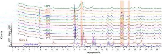Its structural filiation with the sesquihydrate was confirmed by TR-XRPD measurements (Figure 4 and Figure 5). Indeed, the pattern at 100 °C for the fully dehydrated sample is highly similar to that of the sesquihydrate, but specific peak shifts or peak merging could be noticed among them (14.3°, 22.6°, 22.9°, and 24°).