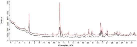 Figure 5. Overlay between XRPD patterns of the solid at 24 °C (sesquihydrate) and the solid at 100 °C (Form III: isomorphous dehydrate). Black curve: 24 °C, red curve: 100 °C.