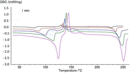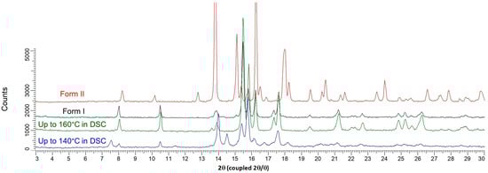 From the hot-stage microscopy experiments (Figure 2 + three videos displaying heating from 100 °C up to 150 °C presented in Supplementary Materials), the small endotherm observed from DSC experiments at ca. 125 °C was assigned as the melting of the new solid Form III below the two other anhydrous forms. This melting process may partially overlap with the sharp recrystallization due to high overcooling (first exothermic peak at approximately 130 °C, zone 3 in Figure 1). The obtained solid was analyzed by X-ray diffraction and consisted of a mixture of defective Form I and II (Figure 6). The mixture of crystals then fully converts into Form I (second small exotherm at ca. 150 °C, zone 4 in Figure 1), which corresponds to the final solid phase of the sample (Figure 6).