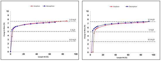 Figure 8. Sorption–desorption isotherms of prednisolone sesquihydrate at 24.9 °C (left) and 48.7 °C (right).