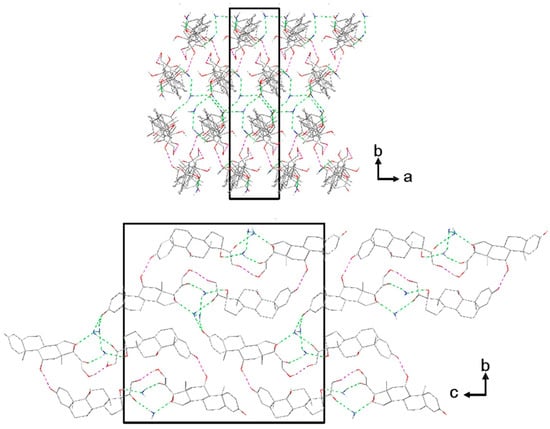 Figure 9. Crystal packing of prednisolone sesquihydrate along the c-axis (up) and the a-axis (bottom) (hydrogen bonds are displayed in dashed lines green or pink regarding if water molecules are involved or not, respectively).