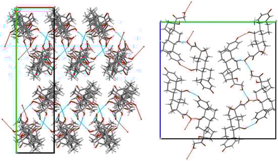 The cohesion of the crystal packing is ensured by both intermolecular H-bonds between prednisolone molecules and H-bonds between the water and prednisolone molecules, giving rise to a three-dimensional PBC network (see Figures S4–S9). An overlay between the two molecules of prednisolone present in the asymmetric unit of this sesquihydrate compound confirms their high similarity in terms of conformations (Figure S10). Even if the crystal structure of Form III has not yet been resolved yet, the crystal packing of prednisolone sesquihydrate has been considered without the water molecules (deleted from the crystallographic data of prednisolone sesquihydrate) and is presented in Figure 10.