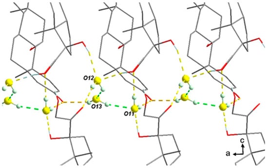 Figure 11. Cluster O12-O13-O11 of water molecules along the a-axis.