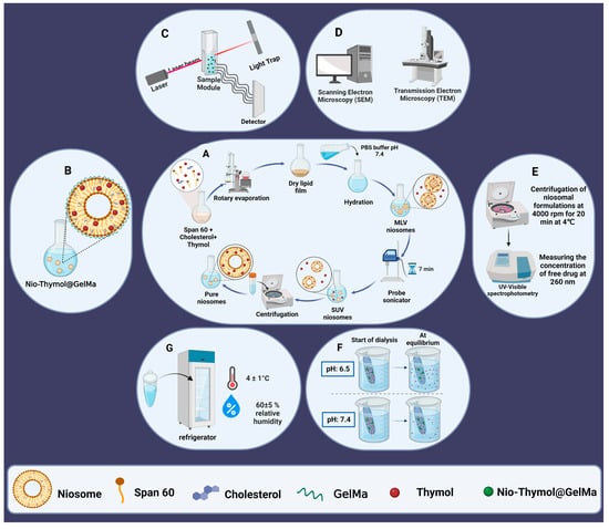 Niosome-loaded Thymols (Nio–Thymol) were prepared using the thin-film hydration method [26]. Briefly, Thymol (10 mg), cholesterol, and Span® 60 were dissolved in 9 mL of chloroform/methanol (2:1; v/v), and the organic solvent was then evaporated under vacuum using a rotary evaporator (Heidolph Instruments, Schwabach, Germany) at 60 °C and 150 rpm for 30 min until a thin dried film was formed in the bottom of the flask. The thin film was rehydrated at 60 °C and 150 rpm for 30 min using PBS (1×, 10 mL, pH 7.4). Subsequently, the niosomal dispersion was sonicated using a probe sonicator (UP50H compact laboratory homogenizer, Hielscher Ultrasonics, Teltow, Germany) for 7 min to homogenize size distribution (Figure 1A). The different niosomal formulations are listed in Table 1.