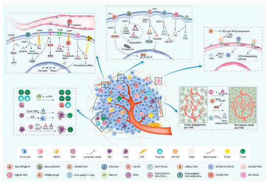 P-glycoprotein (P-gp) is a transmembrane glycoprotein with an energy-dependent “drug pump” function. P-gp can bind to both medicines and ATP, which provides energy to pump intracellular drugs out of cells, lowering the concentration of intracellular medications and resulting in drug resistance [109,110]. Many researchers have confirmed that P-gp is one of the promising therapeutic targets for overcoming drug resistance in cancer [111,112,113]. A class of anticancer drugs known as P-gp substrates can be encapsulated into nanoparticles to avoid the drug resistance caused by P-gp drug efflux [114]. Wang’s research team developed fucoidan-decorated silica-carbon nano-onion nanoparticles (FSCNO NPs), which not only suppress tumor blood vessels by targeting P-selectin but also release P-gp inhibitors and anticancer drugs under low-power NIR to reverse tumor drug resistance [115]. RIP-SAHA is a novel nano-radiosensitizer for breast cancer. It has good colloidal stability and not only promotes the intracellular release of SAHA in tumor cells to enhance DNA damage and restrain DNA repair but also further enhances the sensitivity of tumor cells to radiotherapy due to the high iodine properties of RIP. In conclusion, RIP-SAHA effectively enhances the radiotherapy effect of breast cancer [116].