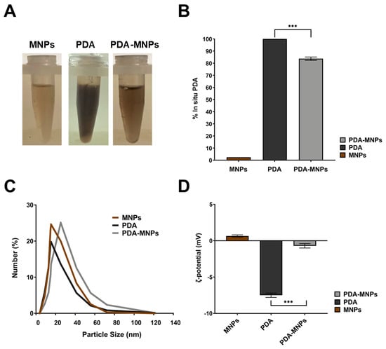 Adsorption of PDA on MNPs. (A) Representative images of dopamine after polymerization reaction (PDA) and MNPs before and after coupling (PDA–MNPs). (B) Values of PDA (polymerized in situ) measured at 550 nm. The percentage ratio between PDA and PDA–MNPs or MNPs alone is shown. (C) Particle size distribution of the prepared PDA-MNPs along with the bare MNPs and PDA, measured by dynamic light scattering (DLS). (D) ζ-potential of MNPs, PDA, and PDA–MNPs detected at pH 7.4. The results were obtained from three independent experiments made in triplicate. Differences between groups were assessed by one-way ANOVA with Bonferroni’s multiple comparison post-test (*** p ≤ 0.001).