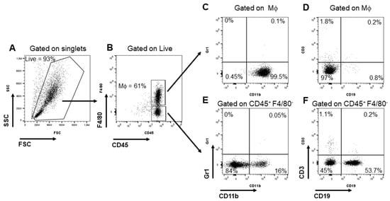 Characterization of primary macrophages from mouse peritoneal exudate (PEMs) by flow cytometry analysis. (A) Representative flow cytometry dot plot of the physical parameters of PEMs. FSC: forward scatter (size); SSC: side scatter (granularity). (B–D) The population of PEMs was characterized using a combination of fluorochrome-conjugated antibodies typical of several immune cell populations: CD45+ F4/80+ (macrophages, Mϕ), CD11b (myeloid cells), Gr1 (granulocytes), CD19 (B cells), and CD3 (T cells). PEMs were F4/80+ CD11b+, and negative for Gr1, CD19, and CD3. (E,F) The CD45+ F4/80− population included monocytes and B cells. The results are representative of three independent experiments.