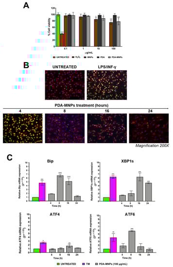The viability of both cell lines was assessed in MTT assays after 3 days of incubation. No significant toxicity was observed in RAW 264.7 cells at any nanoparticle concentration (Figure S2A). Indeed, PDA by itself was highly cytocompatible, so the coupling of PDA on MNPs still improved the cytocompatibility of nanocarriers, as also reported in other studies [,]. In the case of PEMs, a higher toxicity was observed, especially when cells were incubated with the two highest PDA-MNP concentrations of 10 and 100 μg/mL (Figure 3A), which was not surprising, since primary cells might be more sensitive than immortalized cell lines. Nevertheless, the cell viability of PEMs was always around 80%, which is a value above the cut-off of 70% indicated by ISO 10993-5:2009 [] as acceptable for clinical applications. Conversely, both macrophage types were sensitive to the addition of hydrogen peroxide (1 μM) used as a positive control since the viability was reduced to 40%. Thus, these data show that PDA-MNPs are endowed with good cytocompatibility on macrophages. Different types of nanoparticles, including those containing graphene, have been reported to induce cytotoxicity by increasing cellular oxidative stress through the generation of reactive oxygen species (ROS) []. Therefore, we also analyzed the cytocompatibility of PDA-MNPs by assessing the level of ROS in the two macrophage models. Cells were incubated with the highest dose of PDA-MNPs (100 μg/mL) for different periods of time. Afterwards, the levels of ROS were evaluated by the virtual green color (CellROX® Green Reagent) using fluorescence microscopy. As expected, a noticeable amount of ROS was detected in the positive controls of both cell models stimulated with LPS/INF-γ for 24 h, but also when macrophages were incubated with PDA-MNPs. However, both PEMs (Figure 3B) and RAW 264.7 (Figure S2B) macrophages completely extinguished this response after 4 h and 8 h of incubation with PDA-MNPs, respectively. Since oxidative stress is closely connected with protein-folding homeostasis in the ER [], we examined whether PDA-MNPs could affect the pathways linked to ER stress. In cells treated with 100 μg/mL of PDA-MNPs, the UPR response was analyzed by quantitative real-time PCR (q-RT-PCR) assessment of the ER chaperone BiP and XBP1s, ATF4, and ATF6 genes. The corresponding proteins are downstream effectors of the ER stress sensors IRE-1, PERK, and ATF6, respectively []. We used tunicamycin (TM) as a positive control, since it is a known ER stressor []. The results showed that PDA-MNPs were able to activate the UPR response in macrophages. Indeed, in PEMs, ER stress markers were already activated after short incubation with PDA-MNPs, but their gene expression was downregulated after 24 h, except for that of XBP1s (Figure 3C). This finding is in line with the report that XBP1s plays a crucial role in macrophages during inflammatory diseases []. Surprisingly, similar behavior was also detected in RAW 264.7 cells (Figure S2C), despite the fact that, since they are a stable cell line, they should be less sensitive to ER stress. Taken together, these results indicate that even if PDA-MNPs affect both cellular redox balance and the normal function of the ER, they do not alter cellular homeostasis, and they are cytocompatible for prolonged exposure time.