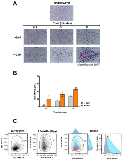 We performed a flow cytometry analysis to assess the PDA-MNP internalization into the cells. PEMs interaction with PDA-MNPs affected their granularity, but not their size after 24 h of incubation with a low amount of PDA-MNPs (20 µg/mL) (Figure 4C). In fact, cellular complexity increased by 80% in PDA-MNP-treated PEMs compared to the untreated controls, and this value underwent a further increase in the presence of a GMF. Therefore, we considered the increase in cellular complexity as an indirect measure of the internalization of PDA-MNPs into PEMs.