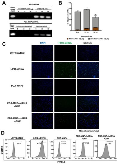 Preparation and the cellular uptake of PDA–MNPs/siRNA in PEM cells. (A) Images showing the loading of siRNA onto nanocarriers examined by agarose gel electrophoresis. Different ratios of MNPs and PDA–MNPs with 10 µM siRNA were used in this typical experiment. (B) Quantification of the percentage of siRNA bound to MNPs or PDA–MNPs, obtained by subtracting the amount of unbound siRNA from the total siRNA after magnetic decantation (densitometric analysis). The results are expressed as % absorption ± SD of the percentage (delta method); they were compared among them for statistical analysis and were obtained from three independent experiments performed in triplicate. (C) Delivery of the siRNAs loaded on nanoparticles into PEMs in the presence/absence of GMF obtained by fluorescence microscopy. Cells were incubated with FITC–labeled siRNA complexes (20 µg) for 24 h. Images were acquired after fixation, permeabilization, and staining for nuclei with DAPI (blue). siRNA transfection with Lipofectamine 2000 (LIPO) and PDA–MNPs alone represent the controls. (D) Cell uptake efficiency in PEMs, measured by flow cytometry. The values of FITC–siRNAs are indicated for each treatment. Statistical analyses were performed using a t–test for each experimental concentration (*** p < 0.001).