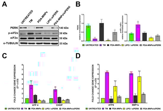 Afterward, the adsorption efficiency of PDA-MNPs/siRNA was quantified by measuring the fluorescence intensity of a FITC-labeled siRNA (50 nM) after coupling with PDA-MNPs (100 μg/mL). The FITC-siRNA concentration associated with PDA-MNPs after ultrasonic stirring for 30 min was about 70% of the amount found in the original solution. The release of siRNA from PDA-MNPs was also analyzed by evaluating the amount of FITC-siRNA remaining bound to nanoparticles after incubation in complete medium at 37 °C with continuous stirring for different times up to three days. The results showed that PDA-MNPs were able to release the adsorbed siRNA under physiological conditions; in particular, around 50% of the adsorbed siRNA was released after three days (Figure S1B). Since PDA-MNPs are capable of carrying siRNA molecules, we evaluated the ability of these nanocarriers to deliver siRNA to PEMs by fluorescence microscopy. For these experiments, 20 μg of PDA-MNPs was functionalized with a FITC-labeled siRNA (Alexa488/siMOCK), then incubated for 24 h with cells. PEMs in which fluorescent-siRNA was transfected through lipofectamine were used as a positive control. When cells were incubated with PDA-MNPs/siRNA, the green, fluorescent signal was slightly detectable, but when a GMF was applied for 30 min before the 24 h incubation, a significant number of green spots were detectable within the cytoplasm (Figure 5C). Thus, the application of a magnet favored the cellular uptake of PDA-MNPs. As expected, no green signal was detectable when cells were incubated with an equal amount of PDA-MNPs. Furthermore, flow cytometry analysis was also performed to quantify the efficiency of siRNA delivery by PDA-MNPs into PEMs, both in the absence and presence of a GMF. In accordance with the data presented above, primary cells could be efficiently transfected, since more than 92% of the PEMs stained positively (Figure 5D). Instead, only 17% of the cells were able to engulf siRNA complexed with PDA-MNPs in the absence of GMF, but the apposition of GMF enhanced the cellular uptake of siRNA coupled to PDA-MNPs by more than 30%. All together, these results indicate that PDA-MNPs could be promising candidates for delivering siRNA molecules within cells, especially when nanocomplexes are exposed to an external magnetic field. For this reason, we also evaluated the ability of PDA-MNPs/siRNA to induce gene silencing of a target protein, such as PERK ER transmembrane sensor []. Therefore, PEMs were either incubated for 24 h or 48 h with siPERK molecules coupled to PDA-MNPs or transfected for the same time with lipocomplexes (LIPO/siPERK), used as a control along with PDA-MNPs alone. After 48 h of treatment with PDA-MNPs/siPERK, PERK protein expression was downregulated in PEM cells, while it was completely silenced in the case of LIPO/siPERK (Figure 6A). Considering that UPR proteins such as PERK are activated in ER stress conditions, we also treated PEM cells in the last 8 h with TM to examine the effect of PERK knockdown on the activation of its downstream signaling pathway. Since the active PERK phosphorylates the downstream mediator eukaryotic translation initiation factor 2 (eif2-α), we also assessed the activation (i.e., the phosphorylation) of this protein. We found that the silencing of PERK significantly reduced the phosphorylation of eif2-α in comparison to the cells treated with TM (Figure 6A,B). A similar behavior was observed when the downregulation of the PERK gene in PEMs was evaluated by analyzing the expression levels of the ATF4 and CHOP genes, downstream effectors of the PERK/eif2-α pathway. In fact, we found that in the presence of ER stress induced by TM, the expression of these two target genes was downregulated in PEM cells because of the incubation with siPERK-containing complexes (Figure 6C). Under ER stress, UPR signal activators act in a coordinated way to detect misfolded proteins in the ER and re-establish cellular homeostasis. Therefore, the activities of IRE-1 and ATF6, other ER stress sensors, along with PERK [], were examined after the knockdown of PERK.