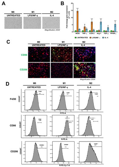PEMs can be polarized in vitro towards the M1 or M2 phenotypes. (A) Images of PEMs after isolation and culture for 5 days with the macrophage colony-stimulating factor (M–CSF) and stimulation for a further 48 h, either with LPS/IFN–γ or IL-4 to induce the M1 and M2 phenotypes, respectively. (B) Relative expression of specific genes for M1 and M2 phenotypes was determined by q–RT–PCR. Gene expression was expressed as a fold change relative to untreated M0 cells. The data are expressed as the fold-change expression ± SD of three independent experiments. (C) Immunofluorescence images of differentiated PEMs into M1 and M2 phenotypes. Cells were fixed, permeabilized, and stained with FITC-streptavidin F4/80 antibody for macrophage identification (red) and DAPI (blue) for the nuclei. The expression of CD86 (upper lane) and CD206 (lower lane) was visualized by green fluorescence. Images were taken at 200x magnification. (D) FACS analyses of the expression of F4/80 (FITC), CD86 (PE), and CD206 (PE/Cy7), markers of macrophages in M0, M1, and M2, respectively. Statistical analyses were performed using one-way ANOVA with Bonferroni’s multiple comparison post-test (* p ≤ 0.05; ** p ≤ 0.01; **** p < 0.0001).
