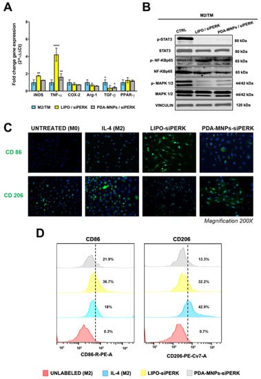 PEMs were incubated for 5 days with 5 ng/mL of m-CSF, as described by Hamidzadeh et al. []. Next, the cells were cultured for 48 h in complete DMEM supplemented with 20 ng/mL IL-4 (Immunotools) to polarize towards the M2 phenotype, or with 100 ng/mL LPS and 5 ng/mL IFN-γ to polarize towards the M1 phenotype []. To obtain TAM-like macrophages, in this study, PEMs were pretreated with IL-4 to induce an M2 phenotype, and then treated for 8 h with the ER stressor TM (2 µg/mL). The expression of genes, cell surface markers, and the activation of molecular pathways associated with two macrophage phenotypes were investigated by different analyses (see below) to confirm that the treatments with the cytokines induced the two phenotypes, as well as the ability of PDA-MNPs/siPERK to reprogram the TAM-like macrophage towards the M1 phenotype.