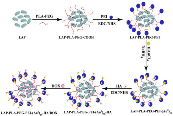 Schematic to obtain LAP-PLA-PEG-PEI-Au-HA/DOX. Reproduced from [62].