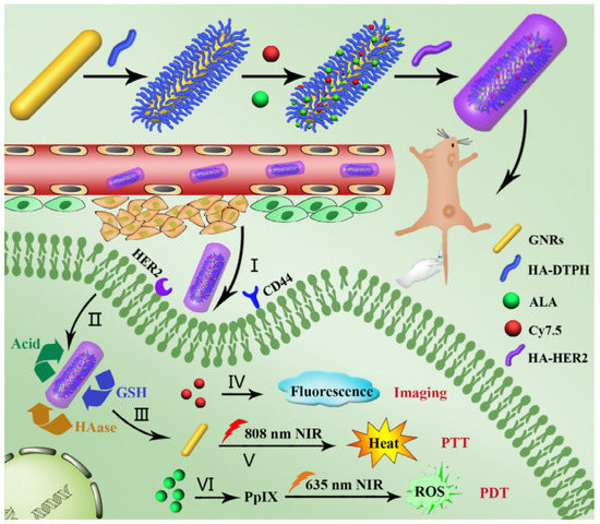 Scheme and respective mechanisms for Au-NR-HA/ALA/Cy7.5-HER2. nanoplatforms. Reproduced from [72].