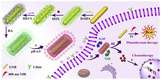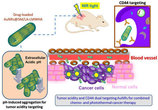 Another part of the research work explored the potential of HA-coated Au-NRs for combined chemo and photothermal cancer therapy by targeting both tumor acidity and CD44, as shown in Figure 6. To achieve this pH-induced aggregation and Au-NR coating, low molecular weight hyaluronic acid (LMWHA) was conjugated with pH-sensitive groups and lipoic acid (LA). The modified LMWHA’s pH sensitivity could be adjusted by changing the pKa values of the pH-sensitive groups. The biocompatibility of the coated Au-NRs was significantly enhanced. The LMWHA-coated Au-NRs could progressively aggregate under minor acidic conditions, promoting accumulation at tumor sites and the Au-NRs provided excellent photothermal ability. Loading DOX on the nanosystem showed 5.0% loading capacity and enhanced cancer cell-killing and tumor growth inhibiting abilities [78].