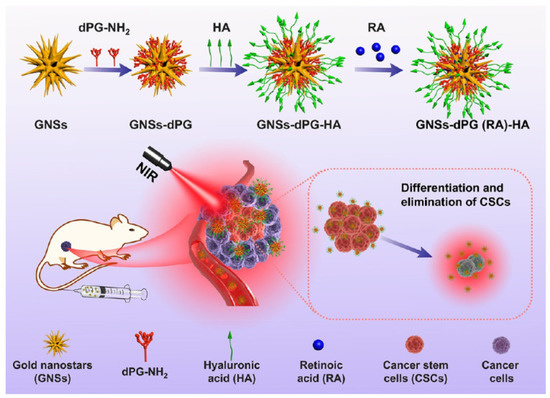 The presence of cancer stem cells (CSCs) represents a foremost challenge to the effectiveness of existing cancer treatments, as non-CSCs can instinctively convert into CSCs, leading to treatment failure and tumor recurrence. Therefore, developing effective strategies to eradicate CSCs is crucial. To solve these issues, a CSC-specific, RA-loaded Au-NS with dendritic polyglycerol (Au-NSs-dPG) nanoplatform was developed for efficient CSC eradication. The designed system exhibited excellent biocompatibility and effective CSC-specific multivalent targeting through HA decoration on the bioinert dPG’s multiple attachment sites. Furthermore, RA-induced CSC differentiation combined with PTT yielded high therapeutic efficacy in a synergistic inhibitory manner, suppressing breast CSCs and tumor growth. Moreover, the expression of stemness genes and CSC tumorsphere development were notably reduced. In vivo, the nanoplatform effectively eliminated tumor growth and CSCs, indicating higher anticancer activity and effective CSCs suppression [82]. The scheme for RA loaded GNSs-dPG for targeted photothermal therapy is shown in Figure 7.