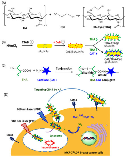 In recent work, Ce6-adsorbed small Au nanorods (Ce6-sAu-NRs), that can activate photothermal and photodynamic effects through NIR/visible light, were produced. The Ce6-sAu-NRs were decorated with biological macromolecules, such as thiolated HA and catalase (CAT), to enable targeting of CD44 and self-supply of O2. This platform unveiled visible-light absorption at 668 nm and robust NIR absorption at 800–1000 nm. The CAT/THA-Ce6-sAu-NRs were able to easily accumulate in CD44-overexpressing MDR breast cancer cells via CD44-HA recognition. Additionally, CAT catalyzed the decomposition of endogenous H2O2 to generate O2, thus mitigating hypoxia and ensuring high PDT efficiency [83]. The scheme and the cellular uptake of CAT/THA-Ce6-Au-NRs with prospects of combined therapy are represented in Figure 8.
