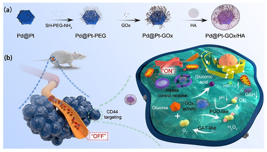 - Ming, J.; Zhu, T.; Yang, W.; Shi, Y.; Huang, D.; Li, J.; Xiang, S.; Wang, J.; Chen, X.; Zheng, N. Pd@ Pt-GOx/HA as a novel enzymatic cascade nanoreactor for high-efficiency starving-enhanced chemodynamic cancer therapy. ACS Appl. Mater. Interfaces 2020, 12, 51249–51262. [Google Scholar] [CrossRef]