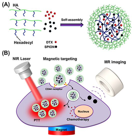 - Zheng, S.; Han, J.; Jin, Z.; Kim, C.-S.; Park, S.; Kim, K.-P.; Park, J.-O.; Choi, E. Dual tumor-targeted multifunctional magnetic hyaluronic acid micelles for enhanced MR imaging and combined photothermal-chemotherapy. Colloids Surf. B Biointerfaces 2018, 164, 424–435. [Google Scholar] [CrossRef] [PubMed]